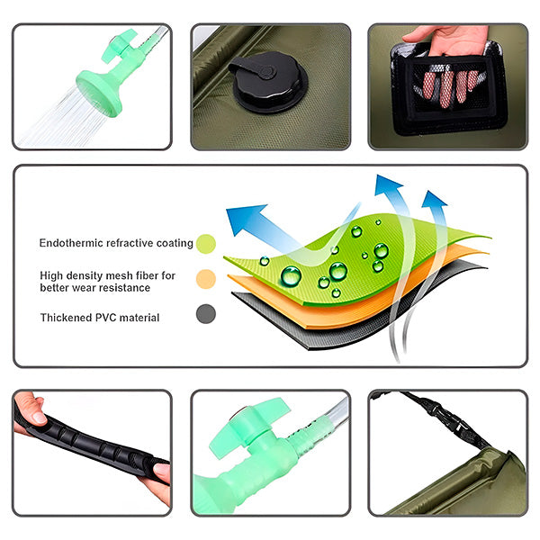 De mobiele buitendouche is je perfecte metgezel voor kamperen, tuinieren of een verfrissend moment in de natuur. Met zijn slimme ontwerp en een capaciteit tot 20 liter biedt hij je een comfortabele douche-ervaring - zelfs op de meest afgelegen plekken. Gewoon vullen, ophangen en genieten!