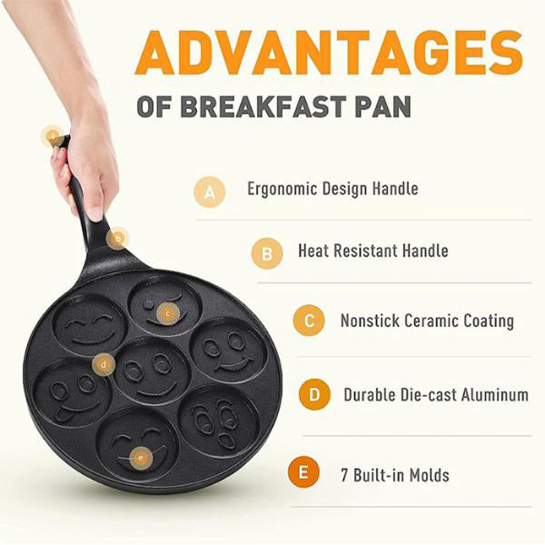 Normale pannen maken het vaak moeilijk om kleine, gelijkmatige pannenkoeken te bakken. De pannenkoekenpan met smileymotief zorgt ervoor dat je pannenkoeken altijd even groot en perfect gevormd zijn. Dankzij de antiaanbaklaag van hoge kwaliteit blijft er niets plakken en is omkeren een fluitje van een cent. Perfect voor gezinnen, speciale gelegenheden of gewoon voor een glimlach in de ochtend!